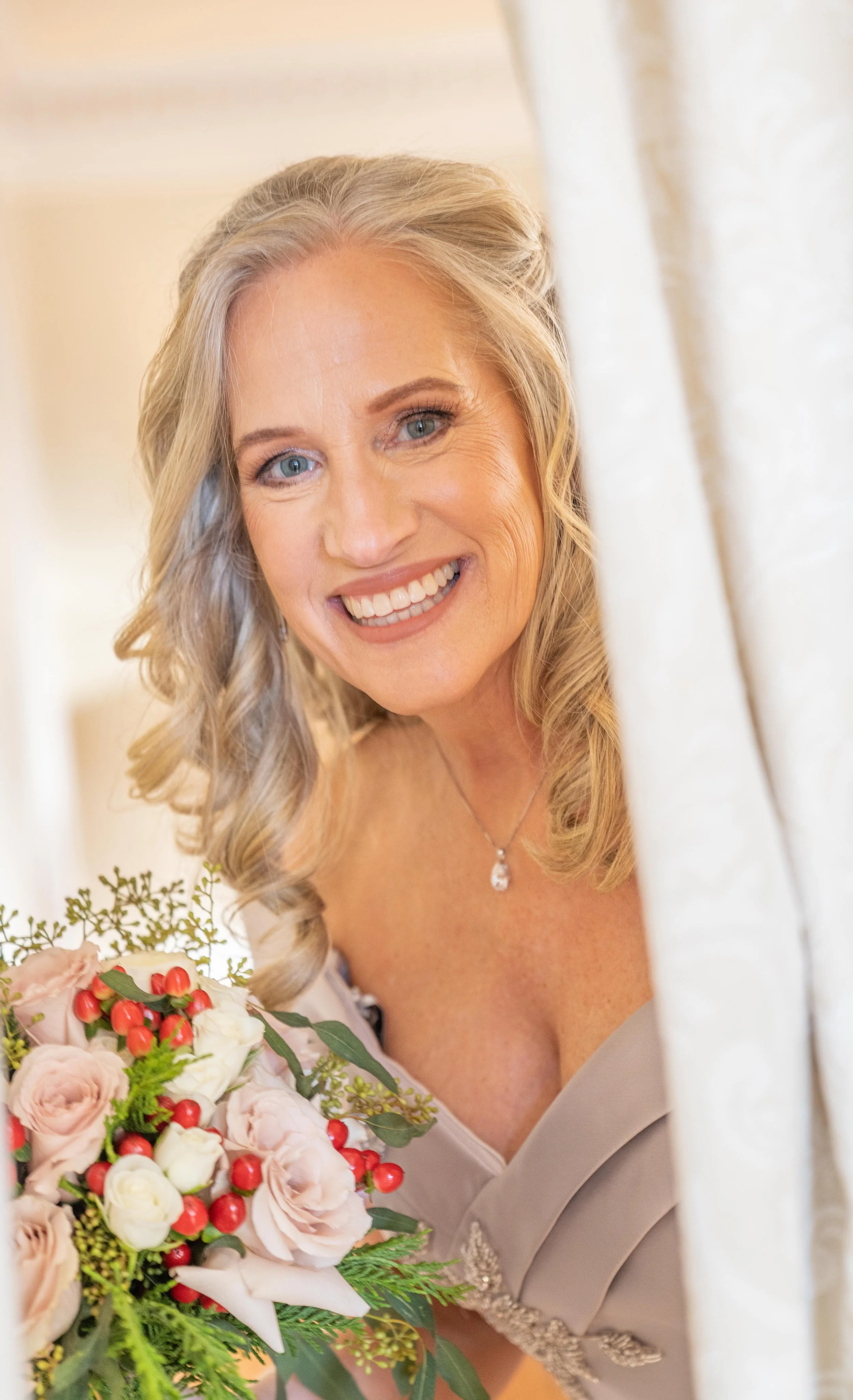 When the bride arrived she put on her dress and as she was doing that we put the groom in his room. Once she was dressed we brought her down stairs for their first look. She was tucked behind the curtains in the parlor. I then brought down the groom and had him put his back to the parlor. She snuck out from the curtains and snuck up behind him and tapped him on the shoulder. He turned around and saw the most beautiful woman in the world. He got emotional seeing her in her wedding dress for the first time and she hugged her husband and best friend Ryan.
