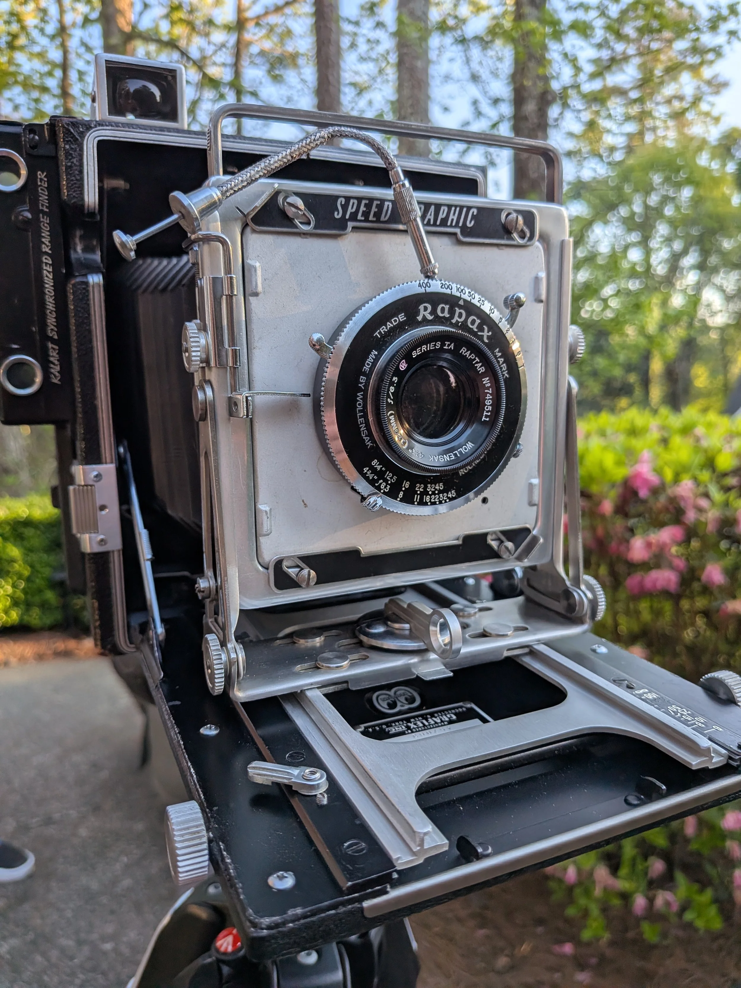 Using film is a lost art and takes a lot of time and preparation. The large format cameras are heavy and they need a tripod to hold them since they also need to have a longer exposure. I used to use an old heavy 40 year old tripod. I recently switch to a newer versatile Manfrotto 3-Section Tripod in Carbon Fiber with carbon fiber. Which is sooo much better than my old tripod.